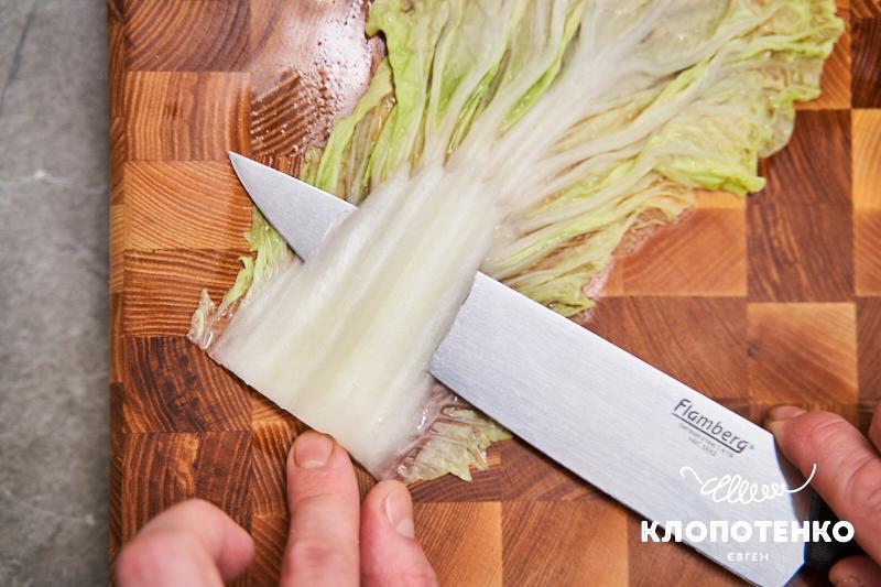 Обріжте білу тверду частину на листі слайсом і трохи знизу, щоб основна частина листка буда тонка і ніжна.