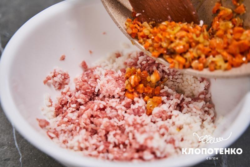 Змішайте 500 г фаршу з відвареним рисом і засмажкою. Посоліть і поперчіть до смаку.