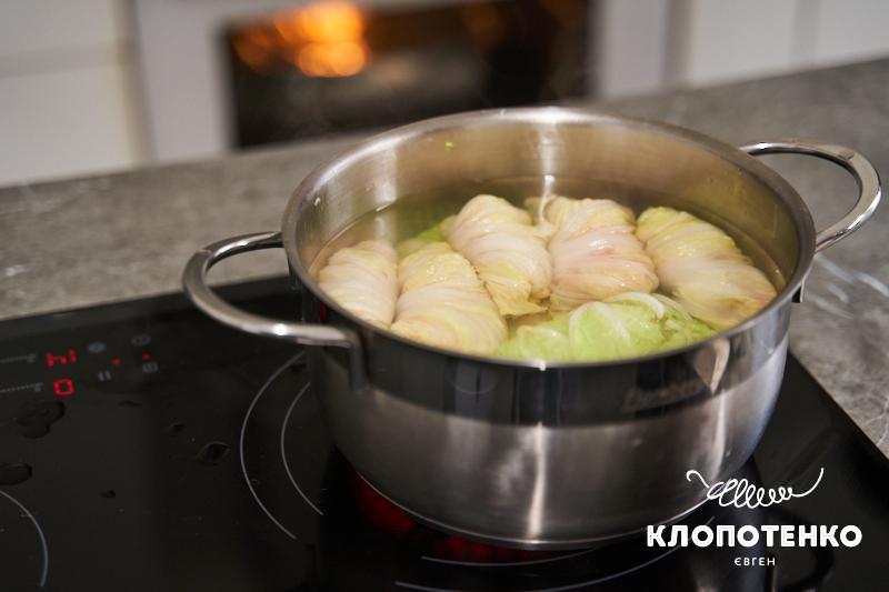 Викладіть голубці в кастулю, залийте водою, щоб вона їх покрила та підсоліть за смаком. Тушкуйте на повільному вогні 30-40 хвилин в залежності від розміру голубців.