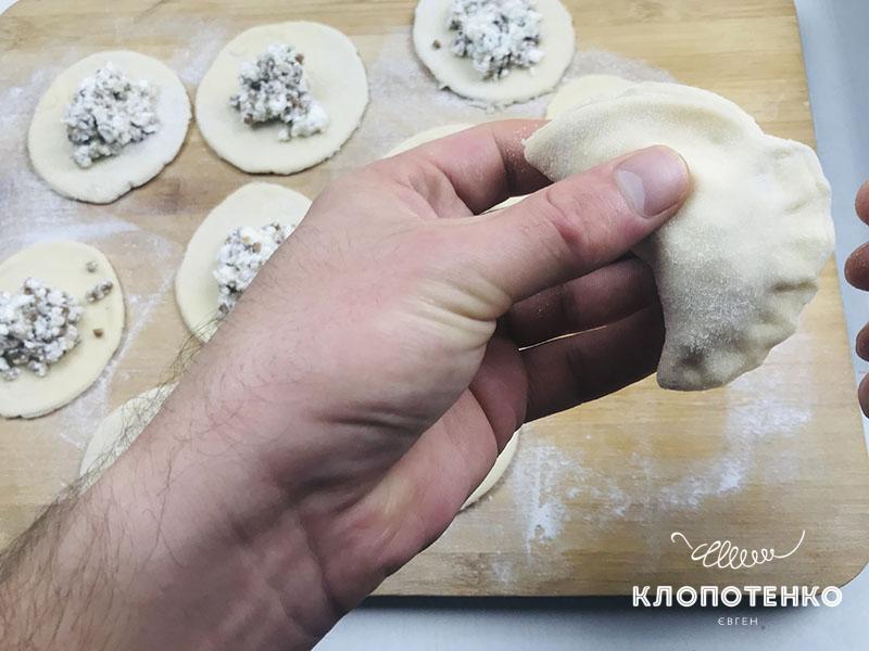 На припиленій борошном поверхні розкачайте тісто та виріжте склянкою чи формою кола. Вкладайте всередину начинку та формуйте вареники будь-яким зручним для вас способом. Головне - намагайтеся добре защипнути тісто, щоб під час варіння начинка не випадала.
