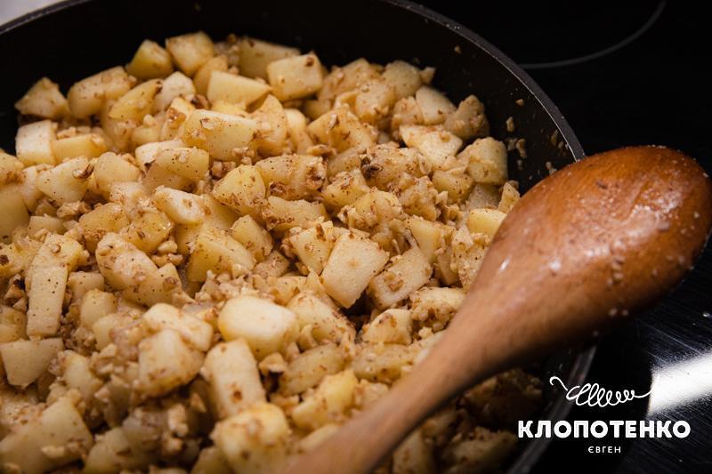 Очистьте від шкірки 5 яблук, наріжте їх невеликим кубиком, прибравши насіння. Збризніть 1 ст.л. лимонного соку, щоб вони не темнішали. Подрібніть ножем 100 г волоських горіхів. Викладіть яблука на пательню та тушкуйте їх 5 хвилин. Потім додайте горіхи, ½ ч.л. кориці та 50 г цукру, перемішайте, тушкуйте ще 2-3 хвилини. Зніміть з вогню і лишіть охолоджуватися.