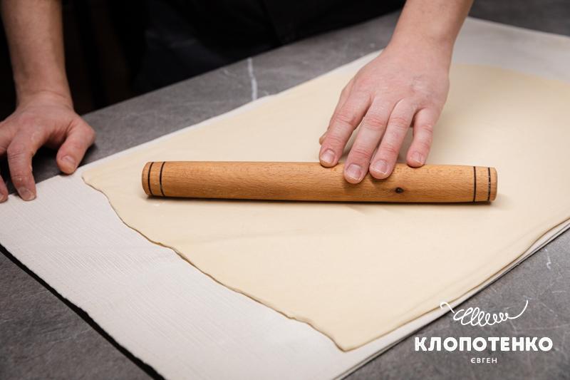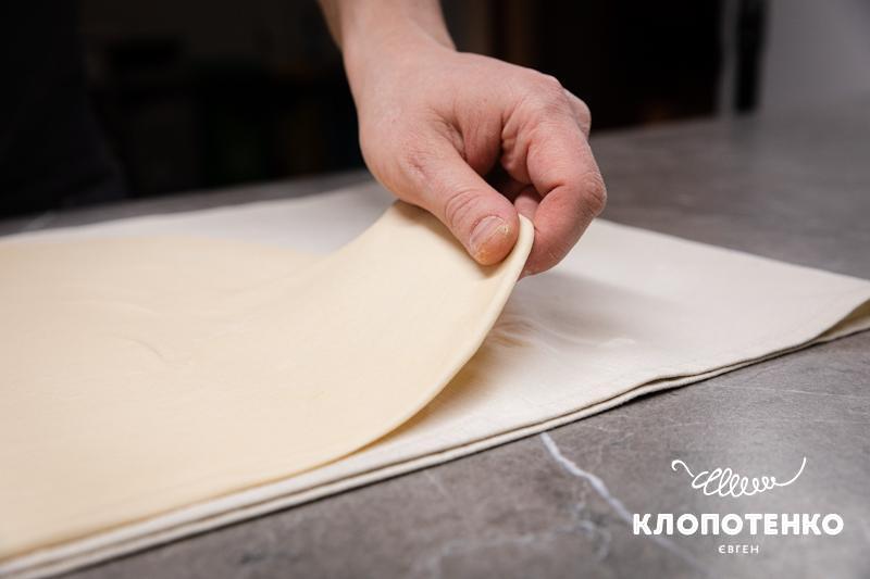 Розтягувати тісто потрібно руками, надаючи йому прямокутної форми. Чим тонше тісто, тим більше ви зможете його закрутити і тим ніжнішим буде десерт. Працювати з тістом потрібно швидко, щоб воно не обвітрювалося.