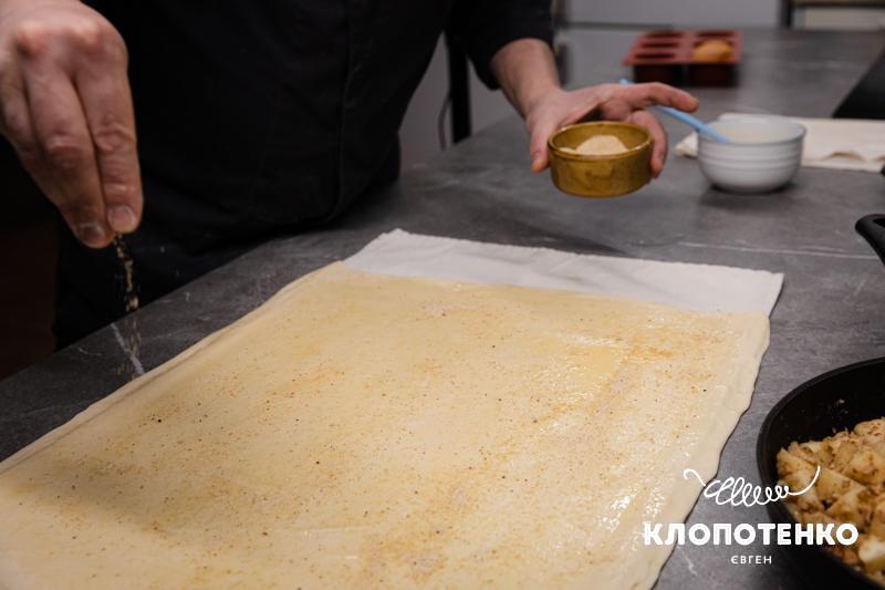 Увімкніть духовку розігріватися до 180 градусів. Розстеліть на робочій пательні рушник і притрусіть його 2 ст.л. борошна. Викладіть тісто та розкачайте його максимально тонко в формі прямокутника.