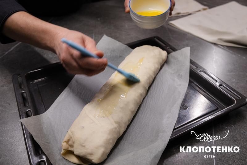 Закрутіть штрудель до кінця. Готовий штрудель перекладіть швом донизу на застелене пергаментом деко. Змастіть верх 20 г розтопленого масла.