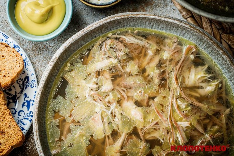 - Чим більше в тарілці чистого м’яса і менше застиглого бульйону, тим вища калорійність порції.