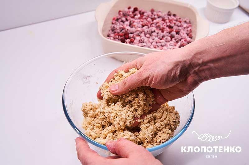 Викладіть у миску 160 г пшеничного борошна, 125 г вершкового масла, 100 г цукру, ½ ч. л. солі, натерту на мілкій терці цедру апельсина та всипте 100 г вівсяних пластівців. Розімніть все руками, доки все змішається й утвориться крихта.