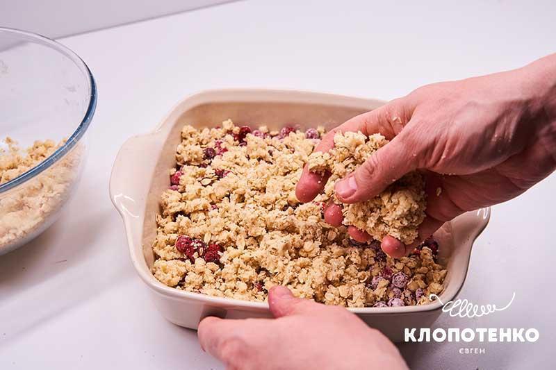 Викладіть вівсяну крихту у форму для запікання зверху на ягоди рівномірним шаром. Поставте в розігріту до 180 градусів духовку на 30 хвилин.