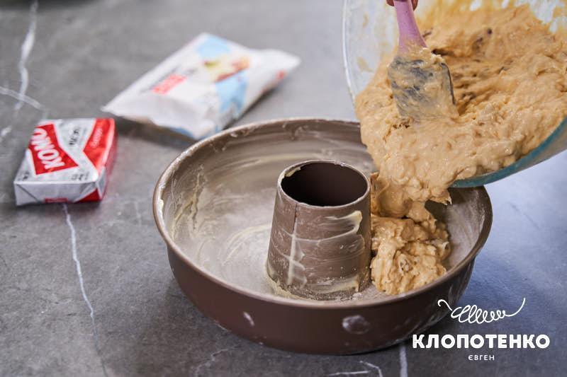 Обробіть форму для випікання методом «французька сорочка». Ви можете взяти прямокутну форму, круглу або з діркою в центрі. Я обрав останню, діаметром приблизно 24 см. Викладіть тісто в форму.