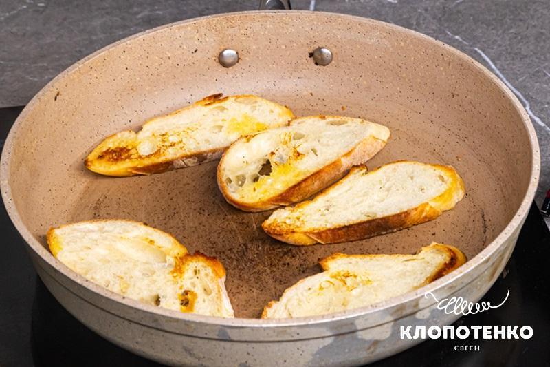 На сухій пательні обсмажте 5 шматочків багета. Потім у розігріту сковорідку насипте 2 ст.л. цукру, зменште вогонь до середнього та зачекайте, доки він розтане.