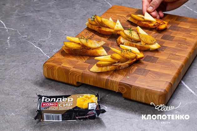 Звісно, у таких не багатокомпонентних стравах особливо важливими стають інгредієнти, які ви обираєте. Для цих брускет найкраще брати сир «Голдер» від КОМО. Це колекційний сир 12-місячного визрівання, тому він особливо добре працює в таких витончених кулінарних історіях, як ця.