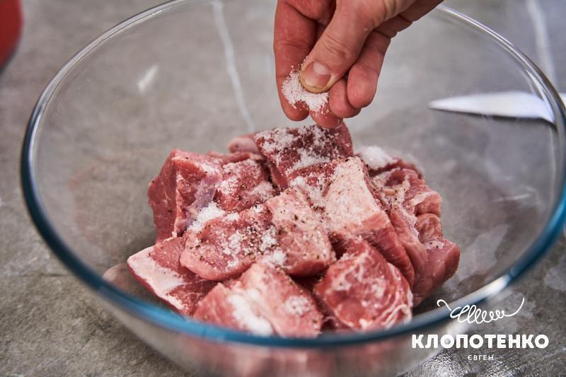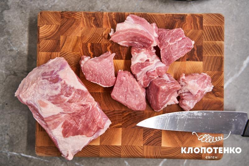 Зачистьте 1 кг м’яса від плівок і наріжте на квадрати по 3-4 см.