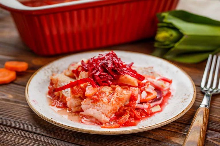 Другі стравиРиба з овочами: минтай у томатному соусі з гарніром