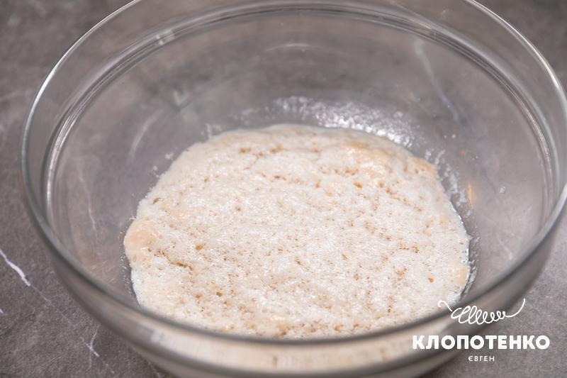 У миску покришіть 20 г пресованих дріжджів, влийте 250 мл теплого молока та 100 г цукру. Перемішайте віничком до однорідного стану, накрийте рушником і лишіть постояти 20 хвилин, щоб опара піднялася.