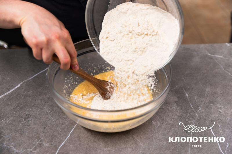 Вбийте в опару 3 яйця та додайте 100 г мʼякого масла. Поступово всипте 600 г борошна, ⅓ ч.л. солі та почніть замішувати тісто.