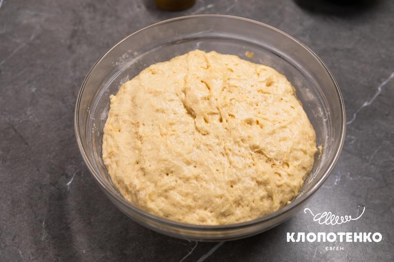 Замішайте тісто, яке не буде липнути до рук, складіть його в миску, накрийте рушником чи плівкою та лишіть на 50 хвилин підходити в теплому місці без протягів.