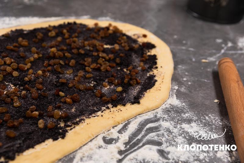 Змажте тісто 50 г мʼякого масла, зверху рівномірно розкладіть макову начинку та родзинки.
