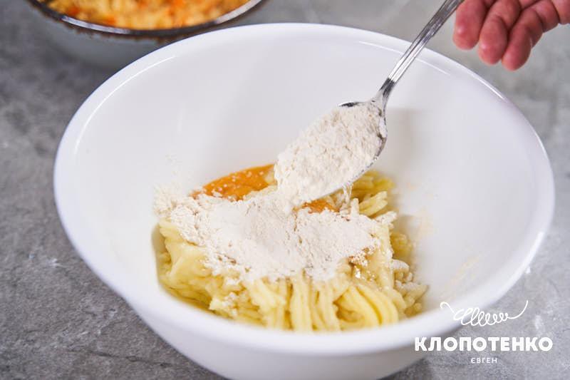 Охолоджену картоплю перекрутіть на м'ясорубці, додайте 2 яйця, 3 ст.л. борошна, 1/3 ч.л. солі. Замісіть однорідне тісто.