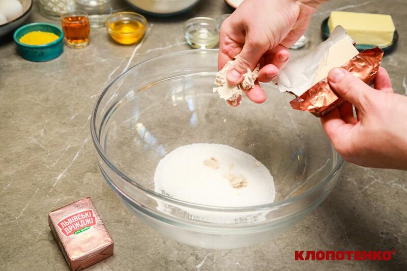 У великій мисці перетріть 25 г дріжджів з 50 г цукру до однорідності. Додайте в миску 250 мл теплого молока та 2 ст. л. борошна. Перемішайте, накрийте рушником і залиште масу в теплі на 30 хв, щоб дріжджі активувалися. Опара повинна збільшитися в об'ємі, а на її поверхні повинні з'явитися бульбашки.