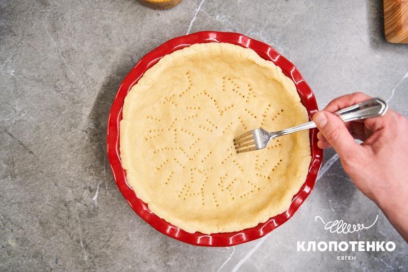 Дістаньте тісто з холодильника, викладіть на пергамент і розкачайте в коло діаметром приблизно 24 см. Перекладіть тісто в форму діаметром 20 см, розподіліть тісто та притисніть до бортів, зайве – зріжте. Зробіть проколи виделкою по всій поверхні тіста.