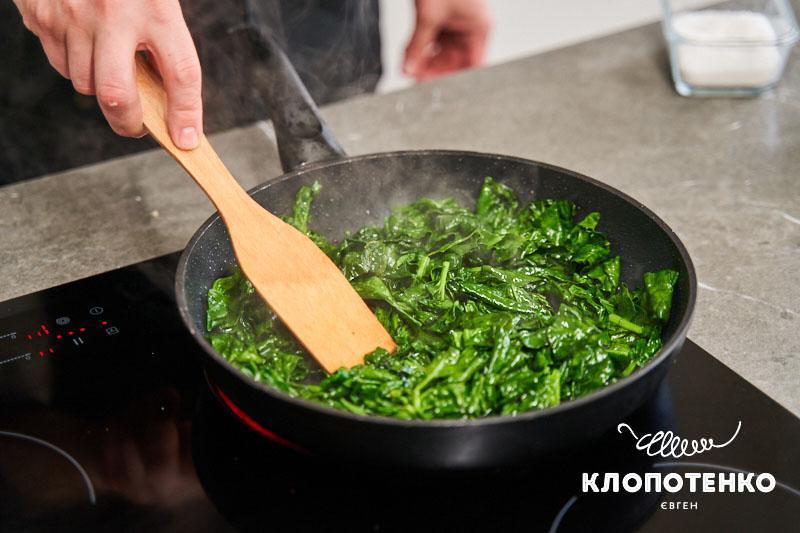 У цей час помийте 300 г листя шпинату і наріжте його довільним розміром. Розігрійте пательню з 2 ст. л. олії, викладіть туди шпинат і припустіть, помішуючи впродовж 2 хвилин. Через часникодавку вичавіть 1 зубчик часнику, перемішайте та зніміть з вогню. 1 лимон наріжте кільцями завтовшки 5 мм, чорні оливки розріжте навпіл.