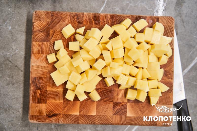 Очистьте 4 картоплини від шкірки та поріжте середнім кубиком. Покладіть у каструлю та варіть до готовності. Тим часом відваріть 3 яйця круто. Вам на це знадобиться 8 хвилин. Перекладіть у холодну воду, щоб потім добре очищалася шкаралупа.