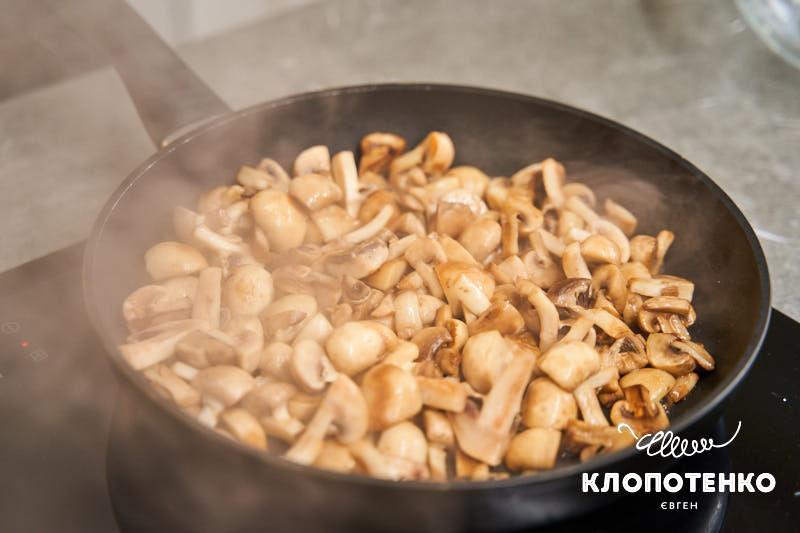 Вимийте 500 г печериць, наріжте на 4 частинки. Викладіть на пательню 20 г вершкового масла та налийте 1 ст.л. олії, обсмажте на цій суміші гриби.